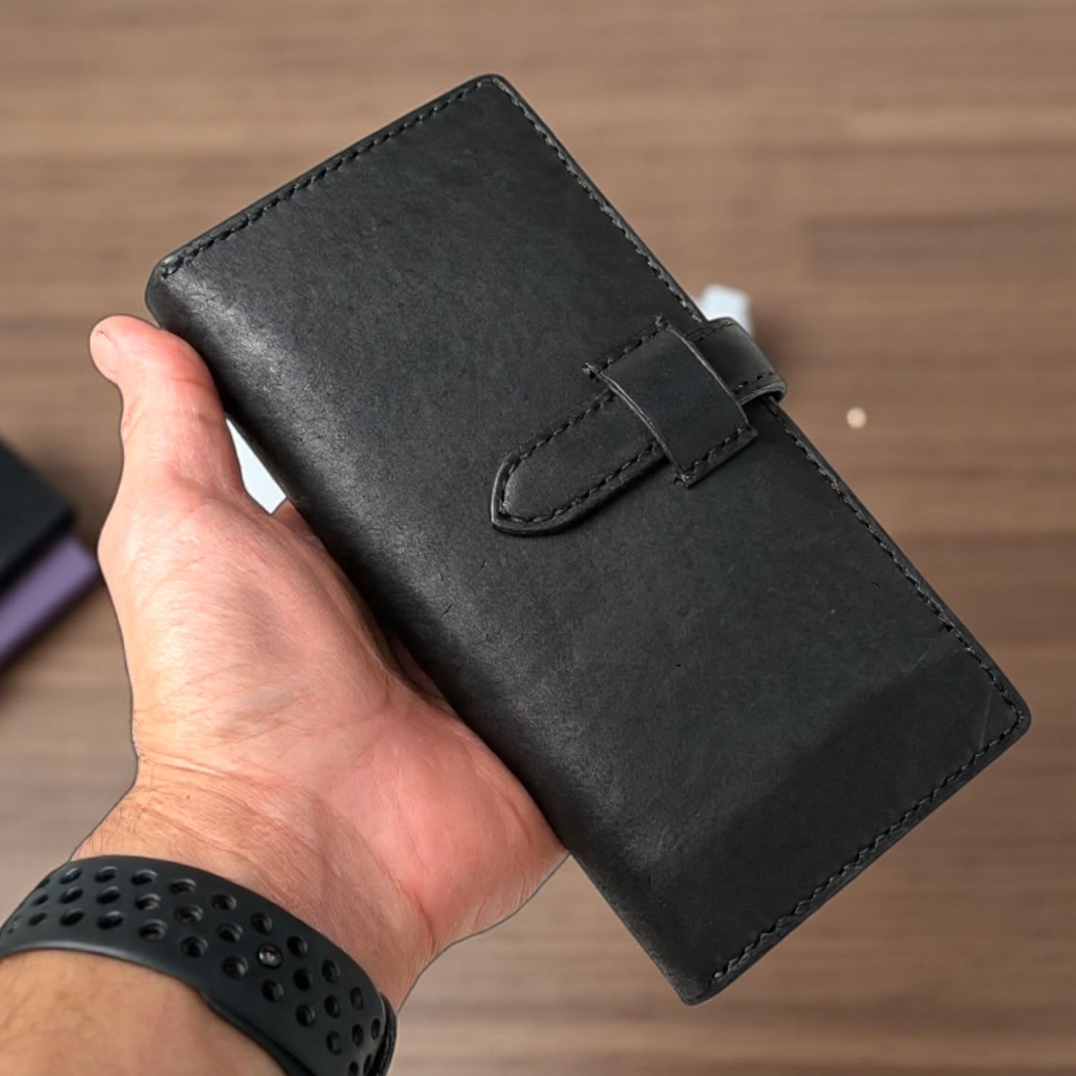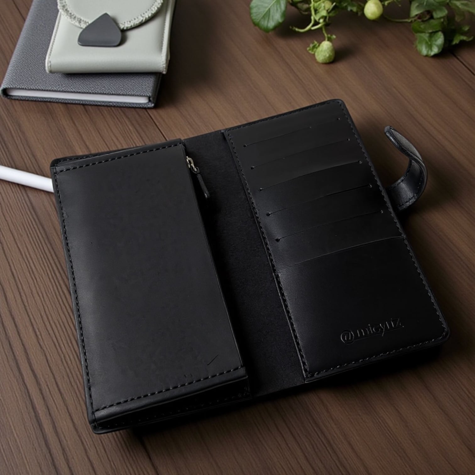 スタイリッシュで機能的な差し込みベルト長財布、たつのレザーのロングウォレットです。驚くほどスリムなデザインにもかかわらず、大容量の収納スペースを持っています。カードやお札、小銭入れに至るまで、必要なものがすっきり整理できる理想的な財布です。